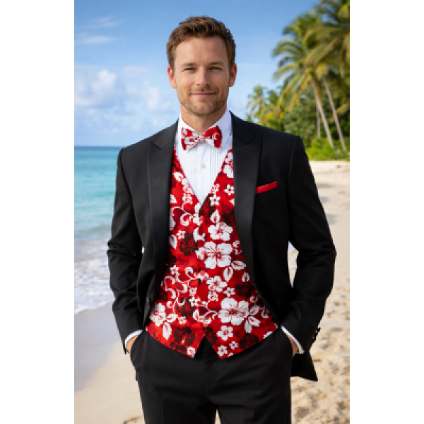 Hawaiian Red Hibiscus Tuxedo Vest & Tie Set – Elegant Tropical Style for Summer Weddings