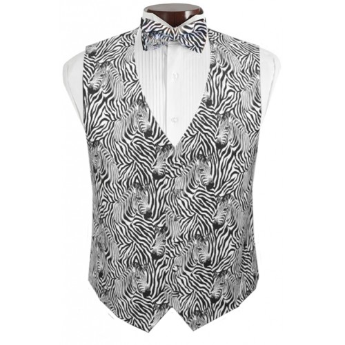 A subtle way to incorporate a little fun into your look, this zebra print vest is made of 100% cotton, the five button style with solid back is classic and sharp, and a hidden adjustable belt gives you a tailored fit. The bow tie arrives pre-tied to look good with every wearing and fits necks up to 21".